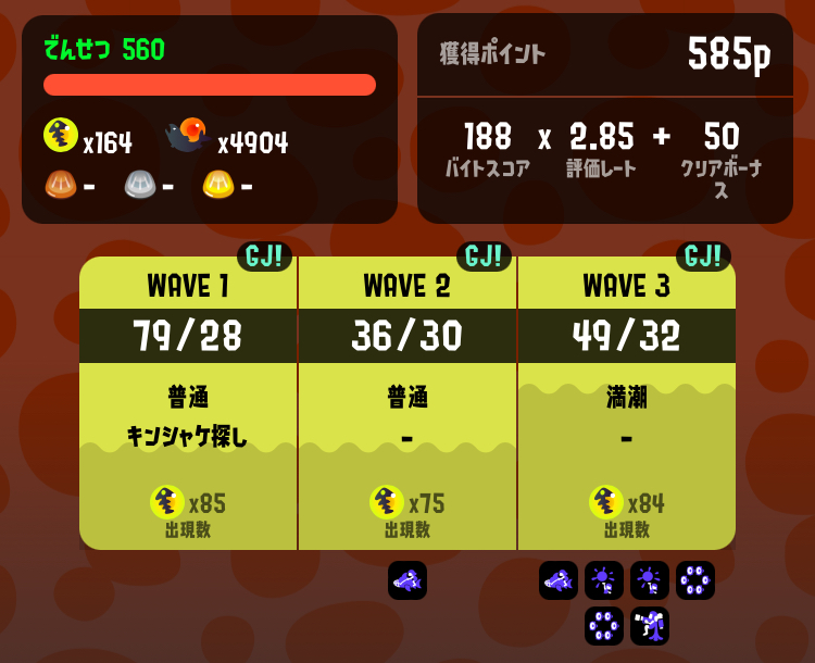 次はそろそろ遠距離ブキ使いたいな、と弓をチョイス。2回目でクリア。