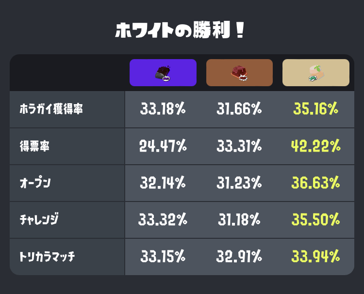 前回も今回も幸運にもイカオンリーのチームだったので、タコちゃんがイカちゃんになっちゃうバグには遭遇せずにすみました。このバグさすがに早急に修正してほしい…。